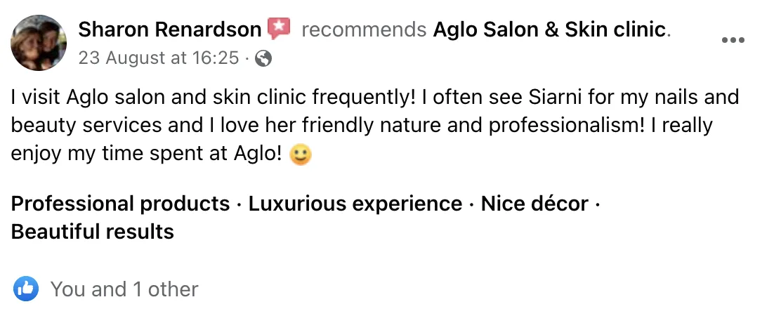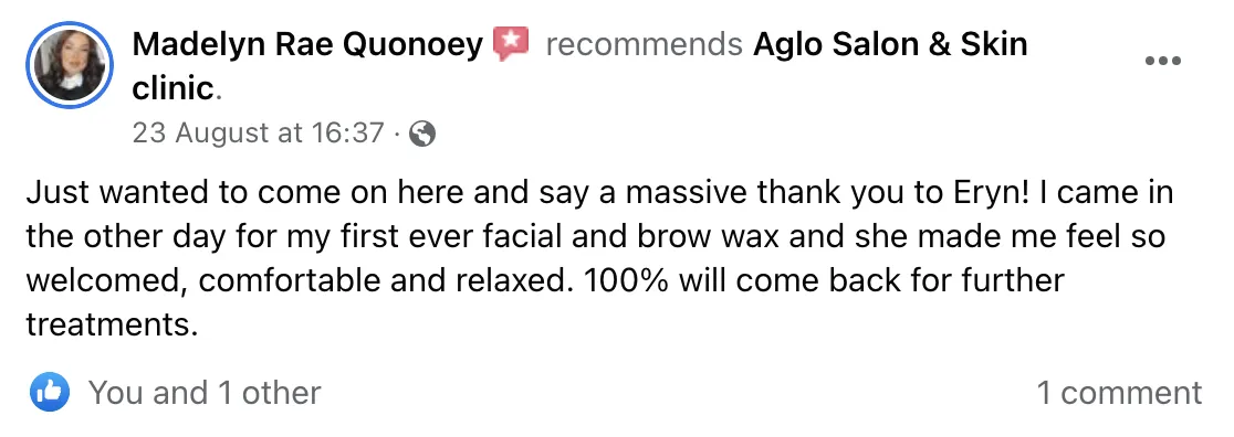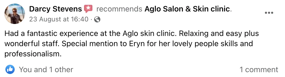 Once this is complete, you will be guided to your candle lit treatment room where your facial will commence, with soft music playing and your customised results driven facial treatment will begin in complete comfort and serenity. Upon completion of your treatment, your therapist will leave the room to carefully prepare your personalised skin care prescription for you. This will consist of 4 core products that is recommend for you to use at home. This is an integral part of our service to all of our clients at aGlo. You will be given the opportunity to ask any questions that you may have in regards to your product prescription or recommended skin journey. You will then be guided to the reception area where your service will be completed and your next booking can be made to continue your skin journey with us at aGlo.